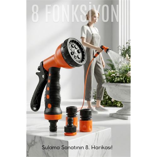 Cevap: Ürünümüz, her türlü sulama ve temizlik ihtiyacınıza uygun olan 8 farklı püskürtme deseni sunar: Jet (Yüksek Basınç), Sis, Koni, Merkez, Duş, Düz, Tam ve Açı.