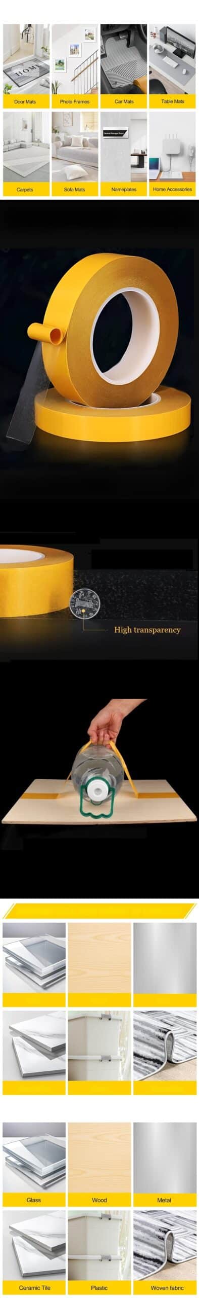 SON DERECE UYUMLU – Bu güçlü çift taraflı bant, sıradan bantla karşılaştırıldığında ekstra bir bez bazlı alt tabaka katmanına sahiptir. Bu yumuşak malzeme, yapıştırıldığında halının kolayca yerinden oynamamasını sağlar. İster düğün ister otel olsun, kenarın kıvrılmasını veya kırışmasını önlemek için halıyı sıkıca yapıştırabilir. Bunu seçerek, halının sağlamlığını sağlamak için halıyı güvenle yapıştırabilir ve birleştirebilir, mekanınıza temizlik ve güzellik katabilirsiniz.