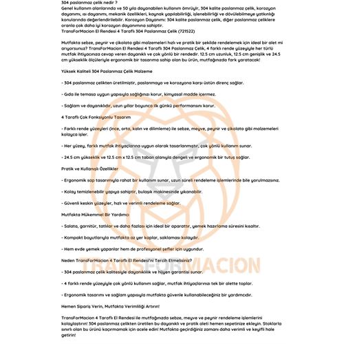 – 4 farklı rende yüzeyiyle çok yönlü kullanım sağlar, mutfak ihtiyaçlarınızı tek bir alette toplar.