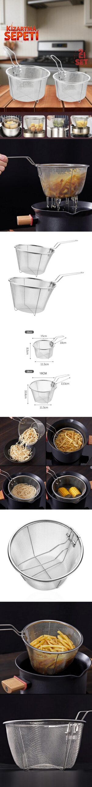 “15 cm ve 18 cm çaplarındaki bu 2’li paslanmaz çelik fritöz sepeti seti, saplı ve tel örgü yapısıyla kızartma, haşlama ve süzme işlemlerinde güvenli, hijyenik ve pratik bir kullanım sunar.”