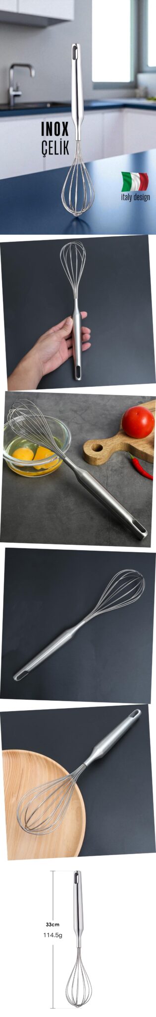 Modern mutfaklar için tasarlanmış bu INOX çelik balon çırpıcı, hem estetik hem de işlevselliği bir araya getiriyor. Italy Design etiketiyle öne çıkan ürün, şık mutfaklarda kaliteyi temsil ediyor.