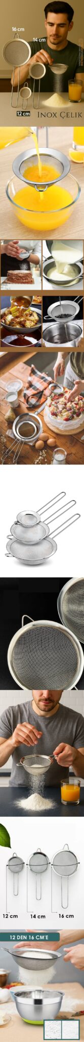 Un, pudra şekeri, nişasta ve ince granüllü ürünleri elemek için tasarlanmış bu 3’lü süzgeç seti, farklı çaplarıyla mutfakta çok yönlü kullanım sunar.