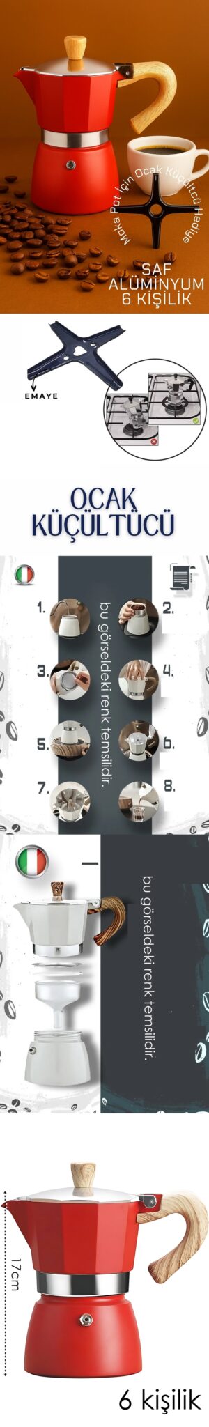 Teknik Ölçüler: – Yükseklik: 17 cm – Kapasite: 6 fincan – Malzeme: Saf alüminyum gövde, emaye ocak adaptörü – Sap ve düğme: Ahşap dokulu ısıya dayanıklı