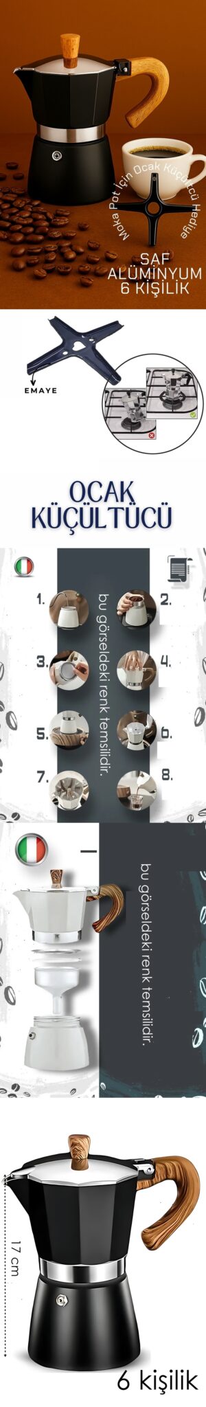 Teknik Ölçüler: – Yükseklik: 17 cm – Kapasite: 6 fincan – Malzeme: Saf alüminyum gövde, emaye ocak adaptörü – Sap ve düğme: Ahşap dokulu ısıya dayanıklı