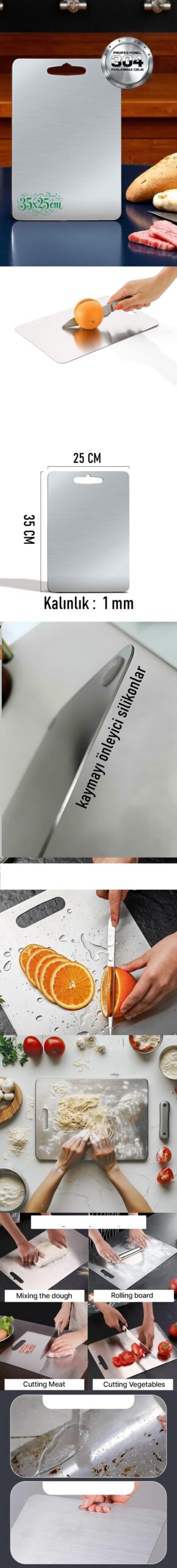“304 paslanmaz çelik doğrama tahtası, kulplu mutfak kesme tahtası olarak hijyenik ve uzun ömürlü kullanım sunar. Tekli paslanmaz çelik kesme tahtası, 35×25 cm ölçüsüyle hem ev hem profesyonel mutfaklar için ideal tercihtir.”Tekli paslanmaz çelik kesme tahtası, 35×25 cm ölçüsüyle hijyenik ve pratik kullanım sunarken, kulplu mutfak kesme tahtası tasarımı sayesinde taşınabilirlik sağlar; 304 paslanmaz çelik doğrama tahtası, profesyonel mutfaklarda tercih edilen çelik doğrama tablası