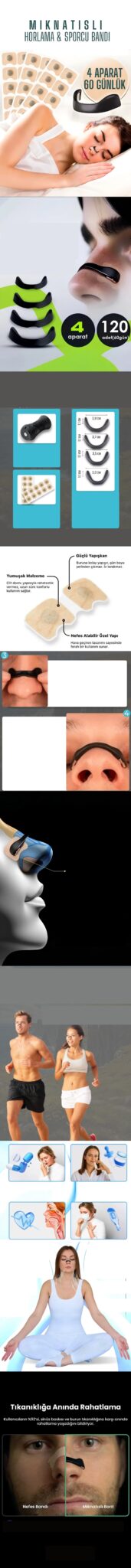 Mıknatıslı  Burun Bandı: – Güçlü yapışkan sayesinde gün boyu sabit kalır, iz bırakmaz. – Yumuşak ve cilt dostu malzeme ile uzun süreli konfor sağlar. – Nefes alabilir özel yapısı sayesinde ferah kullanım sunar. – Özellikle gündüz kullanım ve spor aktiviteleri için idealdir.