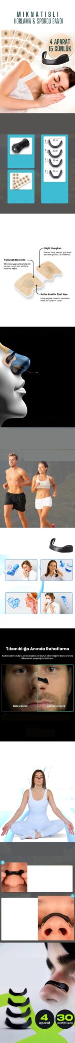 Mıknatıslı Horlama & Sporcu Bandı: – Mikro mıknatıslar sayesinde burun çevresindeki kan dolaşımını destekler. – Uyku sırasında burun tıkanıklığını azaltır, horlamayı önlemeye yardımcı olur. – 4 aparatlık set, 15 günlük kullanım sunar. – Gece kullanımı ve sporcu nefes desteği için optimize edilmiştir.