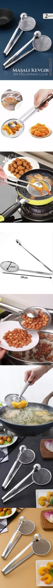 İnce tel örgü kevgir bölümü, yağ ve suyu hızlıca süzerken; maşa yapısı, yiyecekleri güvenle kavramanızı sağlar.