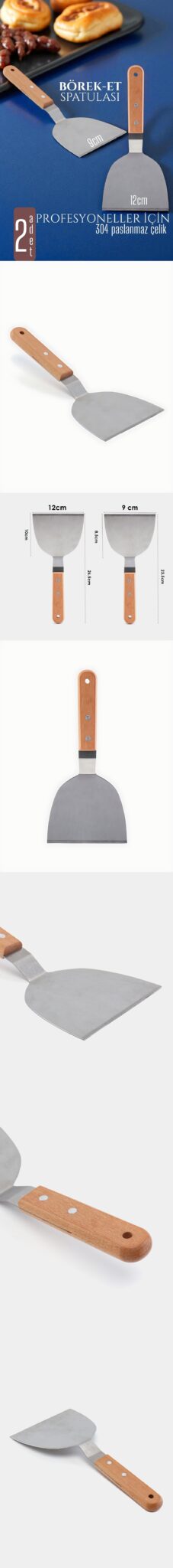 Profesyonel Börek & Et Spatulası – 2’li Set | 304 Paslanmaz Çelik + Ahşap Sap | 9cm & 12cm