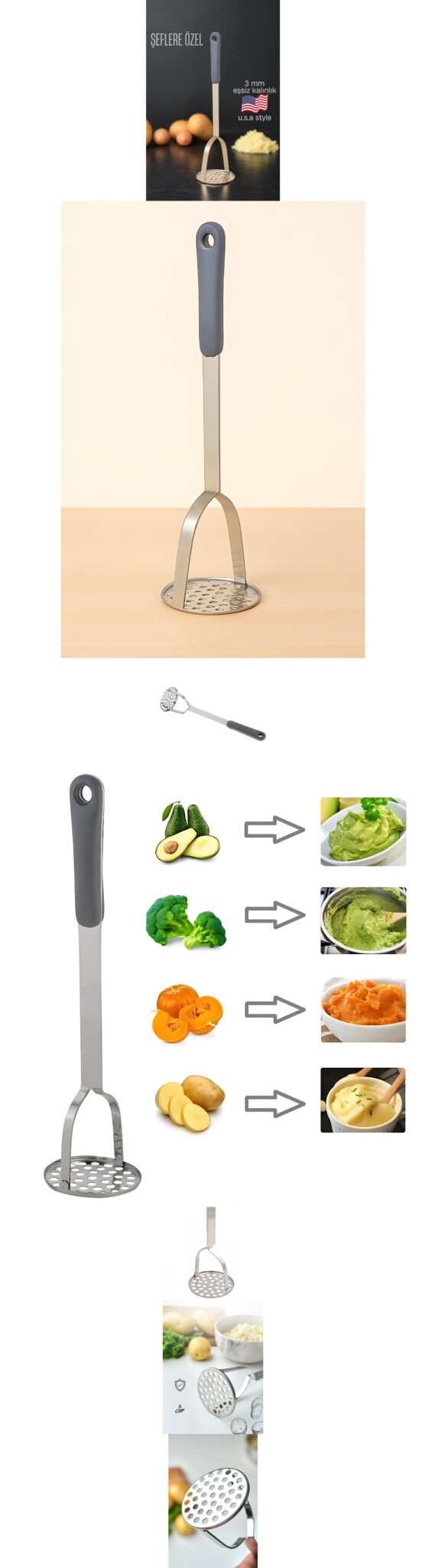 Şeflere Özel Patates Ezici – 3 mm Kalınlık | Paslanmaz Çelik Ezme Plakası + Silikon Sap | U.S.A Style
