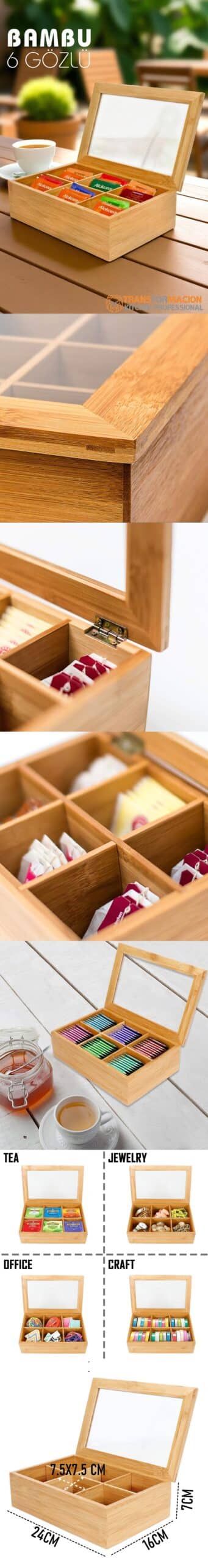 ÜRÜN BOYUTLARI – Çay sandığı kutusu, çayınızı tutmak için 6 yuva ile tasarlanmıştır.  Bu Çay Poşeti Saklama Kutusunun her yuvası, çeşitli çaylarınızı düzenlemek için mükemmel boyuttadır.