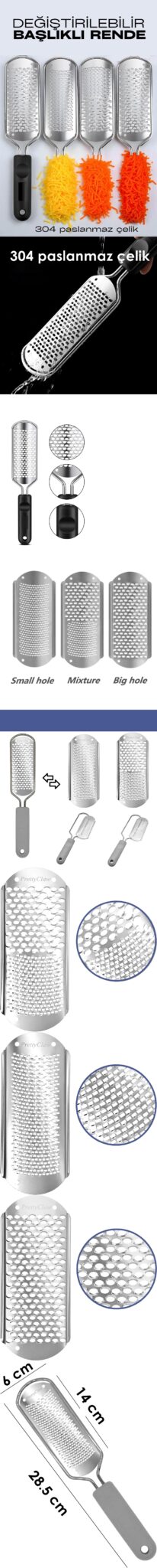 Değiştirilebilir Başlıklı Rende Seti – 304 Paslanmaz Çelik | Küçük, Karışık ve Büyük Delikli 3 Başlık | 28.5 cm Ergonomik Tasarım