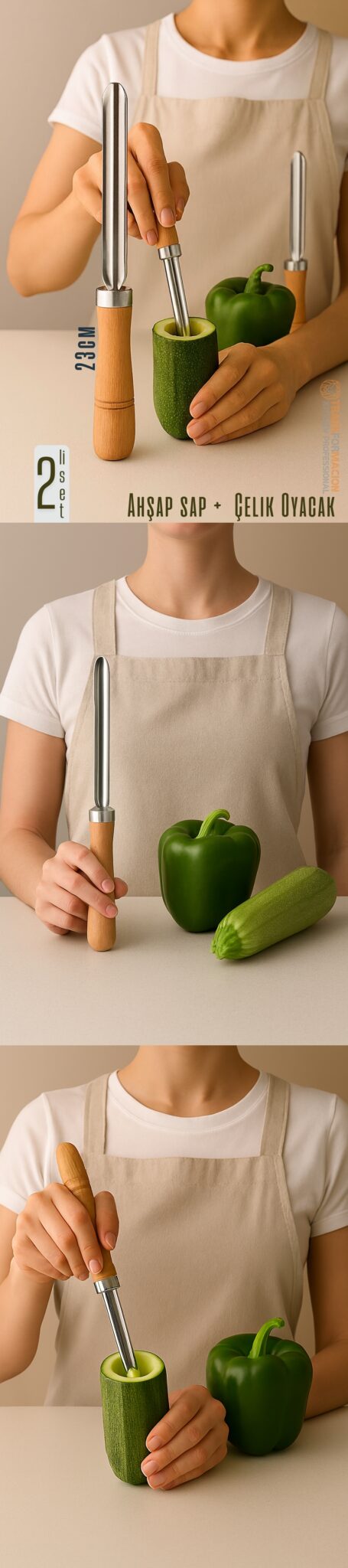 ️ Dolmalık Biber & Kabak Oyacağı – 23 cm | 304 Paslanmaz Çelik + Ahşap Sap | Sepeti Kitchen Professional