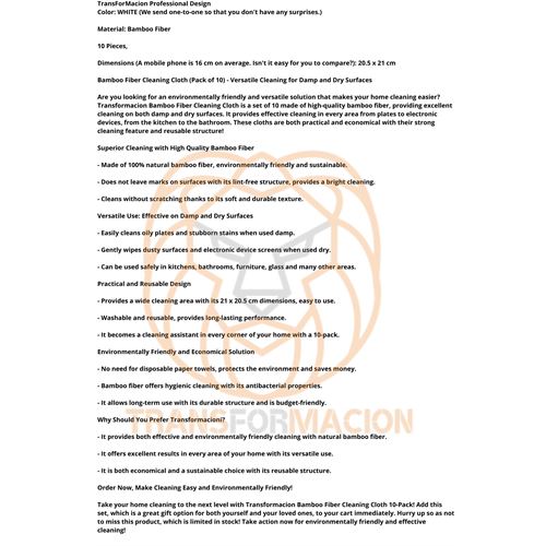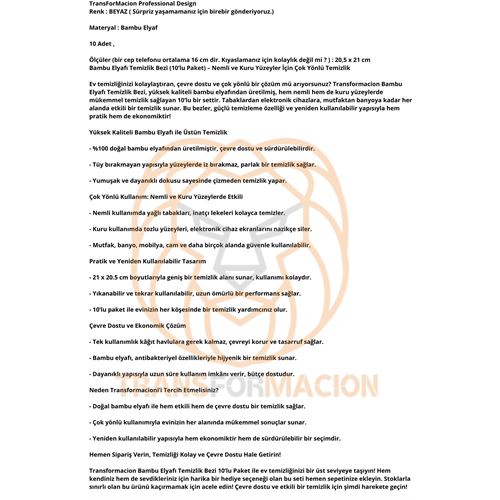 Ev temizliğinizi kolaylaştıran, çevre dostu ve çok yönlü bir çözüm mü arıyorsunuz? Sepeti Bambu Elyafı Temizlik Bezi, yüksek kaliteli bambu elyafından üretilmiş, hem nemli hem de kuru yüzeylerde mükemmel temizlik sağlayan 10’lu bir settir. Tabaklardan elektronik cihazlara, mutfaktan banyoya kadar her alanda etkili bir temizlik sunar. Bu bezler, güçlü temizleme özelliği ve yeniden kullanılabilir yapısıyla hem pratik hem de ekonomiktir!